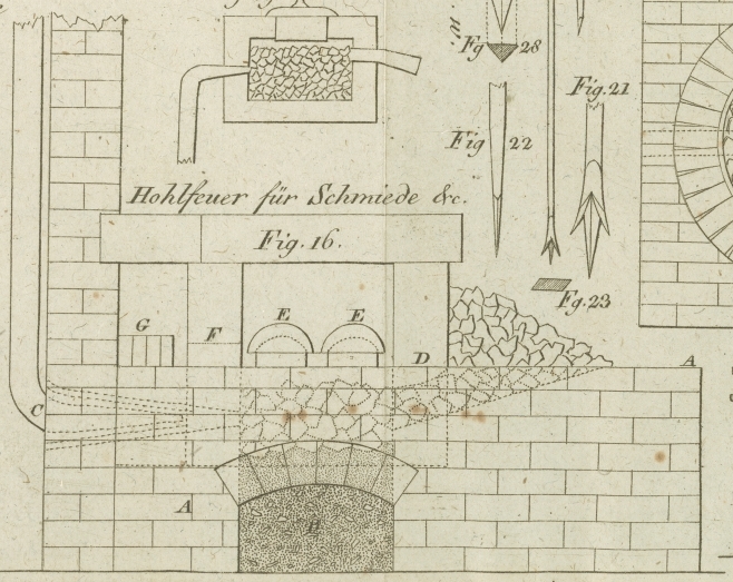 Herd der Schmiede mit einem Bogen, B, unter demselben,
