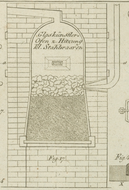 Glaskuͤnstler-Ofens (Glass-Chandelier-Drop-Pincher's Blast Furnace) zur Hizung kleiner Stahlwaaren.