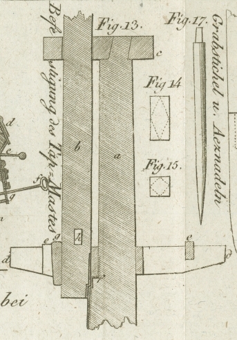 Sahling-Baͤume eintreiben, um den Top-Mast von der Staffel, f, herabzuheben, wo er dann auf die gewoͤhnliche