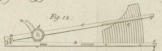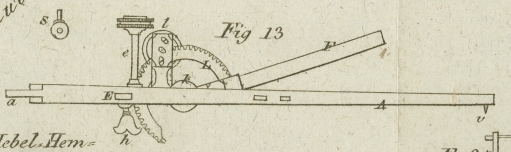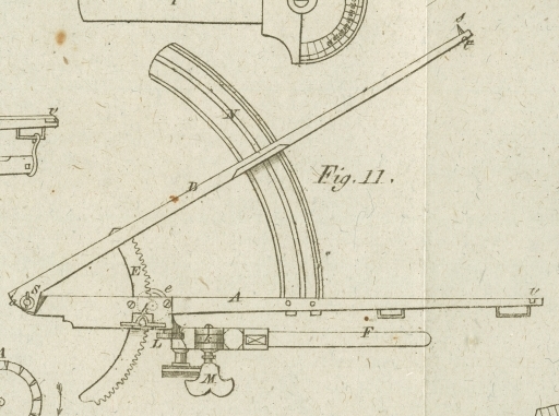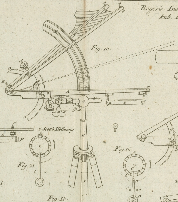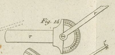 LIX. Verbessertes Instrument zur Bestimmung des kubischen Inhaltes, des auf der Wurzel stehenden Bauholzes, worauf Jak. Rogers, zu Marlborough, sich den 20. März 1824. ein Patent ertheilen ließ. Aus dem Repertory of Arts and Manufactures. Mai. 1824. S. 321. Mit Abbildungen auf Tab. VII. Rogers's, verbessertes Instrument zur Bestimmung des kubischen Inhaltes, des auf der Wurzel stehenden Bauholzes. Fig. 10. zeigt das ganze Instrument im Perspective, mit einem Theile des Dreifußes, auf welchem dasselbe waͤhrend seines Gebrauches steht. Alle Theile in der Abbildung sind in halber natuͤrlicher Groͤße, und dieselben Buchstaben bezeichnen dieselben Gegenstaͤnde in den verschiedenen Figuren. Das Instrument besteht aus drei Metall-Schienen oder Armen, A, B, C, wovon der eine, A, sich in einer horizontaler Lage befindet, und mittelst eines Gewindes, a, mit den beiden Schienen B und C, (die ich der Kuͤrze wegen die Winkelarme nennen will), verbunden ist. Auch diese beiden Winkelarme sind mittelst eines Gewindes, b, so verbunden, daß man den Winkel, welchen sie bilden, nach Belieben vergroͤßern oder verkleinern kann, was mittelst eines kleinen gezaͤhnten Sectors, oder eines Zahnstokes, D, und des Triebstokes, d, geschieht. Der Winkel, welchen die Arme, B und C, mit der horizontalen Schiene, A, bilden, kann gleichfalls mittelst des gezaͤhnten Sectors oder Zahnstokes, E, und Triebstokes, e, nach Belieben vergroͤßert oder verkleinert werden. Sie koͤnnen aber auch zugleich mittelst der Stell-Schraube, h, an der Seite des Sectors, E, unter jedem beliebigen Winkel befestigt werden. An der horizontalen Schiene entspringt ein Metallstuͤk, i, welches mittelst eines starken Gewindes, k, mit einer Stange oder Spindel, F, verbunden ist. Diese Spindel paßt in ein walzenfoͤrmiges Loch in der Metallkugel oder in dem Knopfe, G, an dem obersten Ende des Pfeilers, H; und da dieser Pfeiler auf dem obersten Theile des Dreifußes, I, steht, dient er dem ganzen Instrumente als Stuͤze. Der Knopf, G, hat eine Stellschraube, g, schief an der Seite, welche auf die Spindel, F, druͤkt, und das Instrument in der gehoͤrigen Lage haͤlt. Das Instrument kann zum Theile um das Gewinde, k, mittelst des gezaͤhnten Sectors, L, und des Triebstokes, l, gedreht, und das Gewinde, k, kann zugleich noͤthigen Falles mittelst der Daumschraube, M, festgestellt werden. An der horizontalen Schiene, A, ist eine gekruͤmmte Metall-Platte oder ein Sector, N, befestigt, der von der obersten Seite derselben aufsteigt, und einen Kreisbogen von dem Stifte, a, des Gelenkes aus, als Mittelpunct, bildet. Dieser Sector laͤuft frei durch eine Oeffnung oder einen Ausschnitt in dem Winkelarme, B, und ist auf beiden Seiten so in Grade getheilt, daß er den Erhoͤhungs-Winkel der Arme, B und C, uͤber die horizontale Schiene, A, andeutet, wie wir unten zeigen werden. An dem Winkel, B, ist gleichfalls eine Sector-Platte, O, befestigt, welche von der inneren Seite desselben entspringt, und von dem Stifte des Gewindes, b, aus, als Mittelpunct, einen Kreisbogen bildet. Diese Sector-Platte ist so angebracht, daß sie frei durch eine Oeffnung oder durch einen Ausschnitt in dem Winkelarme, C, durchlaͤuft, und ist mit verschiedenen Maßstaͤben graduirt, um den Winkel zwischen den beiden Armen, B und C, zu bemessen, wie wir unten zeigen werden. P, ist eine kleine Weingeist-Wasserwage, welche an Augen oder Buͤgeln an der unteren Seite der Schiene, A, haͤngt, und dieselbe in eine horizontale Lage stellen hilft. Die Central-Stifte der Gewinde, a und b, sind zur Aufnahme kleiner Metall-Platten durchbohrt, wie R und S, in der Zeichnung besonders zeigt: es sind sehr kleine Oeffnungen in denselben angebracht, die zum Visiren auf die Gegenstaͤnde dienen, welche gemessen werden sollen, zu welchem Zweke auch die Enden der Arme, A, B, und C, mit kleinen hervorragenden Spizen, ss, tt und v, angebracht sind, um die Visirungs-Linie darnach richten zu koͤnnen. Fig. 11. stellt den oberen Theil des Apparates im Seiten-Aufrisse dar. Fig. 12. zeigt einen Grundriß der Winkelarme, B und C, die von dem uͤbrigen Theile des Instrumentes abgenommen sind. Fig. 13. ist ein Grundriß der horizontalen Schiene, A, mit ihren Anhaͤngseln unter derselben. Ich will jezt die Weise angeben, wie die Bogen oder Sectors, N und O, in Grade eingetheilt werden muͤssen, und mit dem, Bogen, N, anfangen, der zur Bestimmung der Hoͤhenwinkel dient. Das Instrument ist bestimmt in einer Entfernung von 24 Fuß von der Basis, oder der Wurzel des Baumes zu stehen, wenn derselbe klein oder mittelmaͤßig groß ist, und in einer Entfernung von 48 Fuß, wenn er groß und hoch ist. Aus diesem Grunde werden zwei verschiedene Maßstaͤbe gradweise auf dem Sector, N, aufgetragen, welche mit diesen Entfernungen correspondiren. Derjenige Theil des Maßstabes, z.B., welcher zu Hoͤhenmessungen gebraucht wird, wenn der Mittelpunct, a, des Instrumentes in einer Entfernung von 24 Fuß von der Basis des Baumes sich befindet, ist, fuͤr jede drei Zoll Hoͤhe auf einer Basis von 24 Fuß, mit den Sinus Rectus der Winkel bezeichnet, und auf eine aͤhnliche Weise ist der andere Theil des Bogens fuͤr eine Grundlinie von 48 Fuß eingetheilt. Diese Art, die Maßstaͤbe aufzutragen, wird allen denjenigen leicht verstaͤndlich seyn, die mit der Art, mathematische Instrumente einzutheilen, bekannt sind. Um aber dieselbe so deutlich als moͤglich zu machen, will ich das Verfahren beschreiben, welches ich wirklich in Anwendung bringe, wenn ich die Eintheilungen auf die oben beschriebenen Instrumente auftrage. Ich ziehe auf einem ebenen und vollkommen geraden Brette eine gerade Linie, und nehme einen Punct auf einem Ende der Linie als Mittelpunct an; dann errichte ich in einer Entfernung von 3 Fuß von diesem Mittelpuncte eine Senkrechte auf diese Linie, und theile diese Senkrechte in gleiche Raͤume von 1 1/2 Zoll, was als Maßstab fuͤr eine Basis von 24 Fuß dient. Auf aͤhnliche Weise theile ich die Senkre