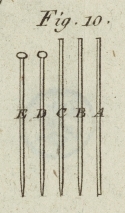 sich schnell dreht, und das Ende des Drahtes zuspizt, wie B, in Fig. 10. zeigt. Hierauf kommt die Nadel mittelst des zweiten