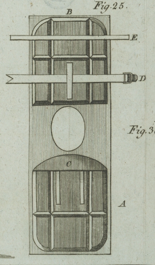 ausgedruͤkt. Noch ein starkes Band ist auf der unteren Reihe der Korke, E, in Fig. 25. am Hintertheile