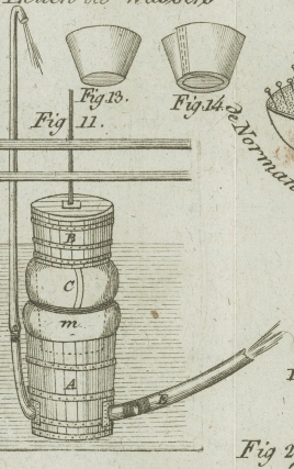 Den Theil, C, nenne ich den Verbinder, indem er zur Verbindung der Gefaͤße, A, und, B, mit seinem oberen