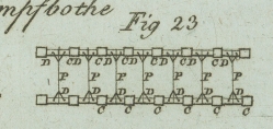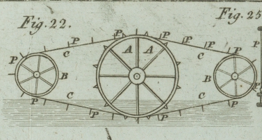 LXXXIII. Ruderkette fuͤr Dampfbothe. Von Hrn. Dixon Vallance. Aus dem Glasgow Mechanics' Magazine. N. 125. S. 165. Mit Abbildungen auf Tab. VII. Vallance's, Ruderkette fuͤr Dampfbothe. Die Maͤngel der Ruderraͤder sind bekannt. Gegenwaͤrtige Vorrichtung scheint allen, denen ich sie zeigte, eine Verbesserung im Treiben der Ruder. Ich weiß, daß man eine mit Rudern versehene Kette bereits versuchte, und sie sowohl beim Ein- als Austritte in das Wasser fehlerhaft fand; ich denke, diesen Maͤngeln ist auf vorliegende Weise abgeholfen. A, A, (Fig. 21.) ist ein großes Rad, oder eine Trommel mit Zapfen an der Peripherie, um in die obere und untere Kette einzugreifen. B, B, sind zwei kleinere Trommeln, uͤber welche die Kette laͤuft, und die dazu dienen, dieselbe in gehoͤriger Lage zu erhalten: jede Trommel ist mit einem aufstehenden Rande versehen, um das Abglitschen der Kette zu verhindern. Eine der kleineren Trommeln laͤßt sich schrauben, so daß sie die Kette spannen oder nachlassen kann, und beide koͤnnen gehoben oder gesenkt werden, so daß die Ruder mehr oͤder minder tief in das Wasser schlagen. In Fig. 21. sind Ruder, Ketten, Trommeln, und die Wasserlinie gezeichnet, und die kleinen Trommeln uͤber den Mittelpunct des Wasserrades gehoben. In Fig. 22. stehen die Trommeln auf gleicher Hoͤhe mit dem Wasserrade, dem Mittelpuncte nach. Fig. 23. zeigt einen Theil der Kette mit den daran befestigten Ruderschaufeln, die an jedem Ende mit eisernen, auf die Ketten aufgeholzten Klammern versehen sind. E, E, E, E, sind Theile der Kette. P, P, P, P, die Ruderschaufeln. D, D, D, D, die Klammern.