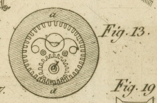 anderen Geschwindigkeit dreht, als die große Rolle. Der innere Umfang der Rolle, a, ist mit einem hohlen, mit kleinen Zaͤhnen