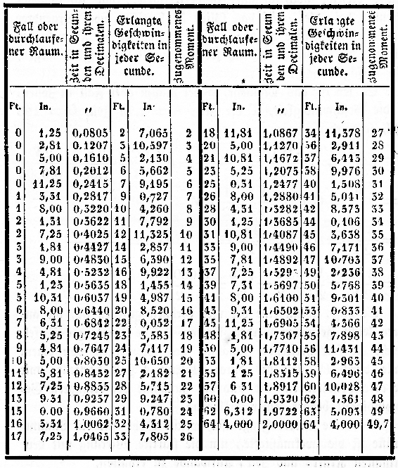 Zunahme des Momentes von einem Falle durch 1 1/4 Zoll bis durch 64 Fuß 4 Zoll