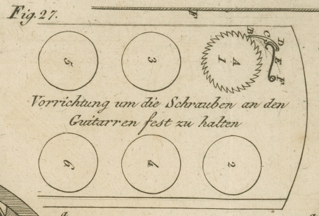 zeigt das obere Ende einer Guitarre von der Ruͤkseite mit dem Apparate zur