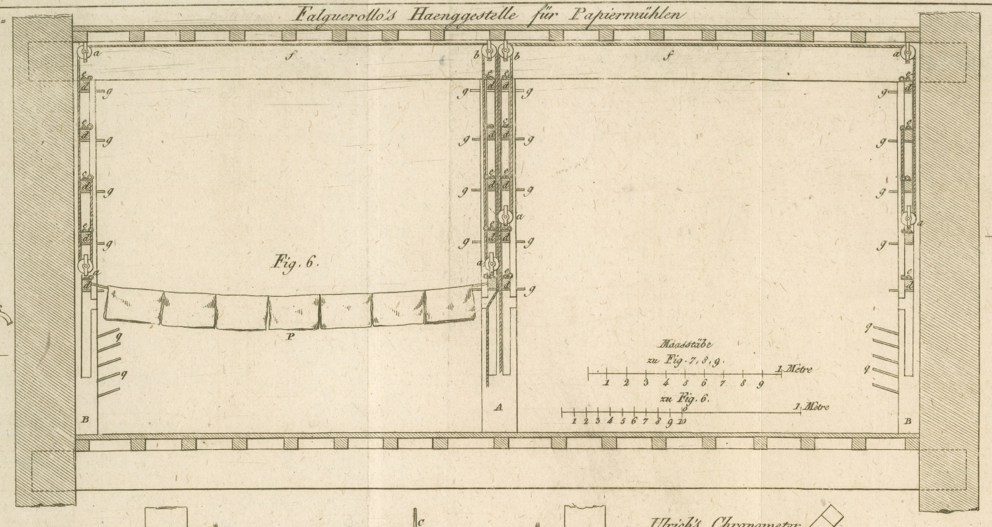 Das Troknen des Papieres erfordert große Saͤle. Gewoͤhnlich stehen in