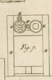 Zahnrad, E, fuͤhrt, und in dem Gestelle, M, mittelst zweier Zapfen gehalten wird. Dieses Gestell