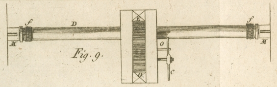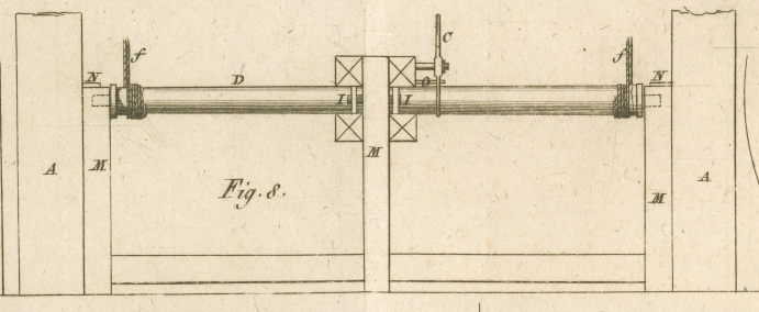 Nachdem diese erste Arbeit vollendet ist, rollt der Arbeiter die Schnuͤre, f, von der Welle, D, ab,