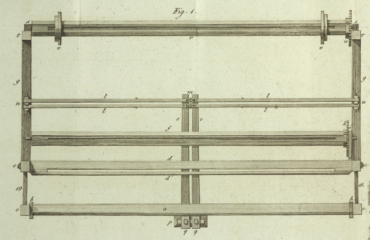 uͤbrigens noch im Grundrisse die Lage der Bahn, m, auf dem darunter befindlichen Ladenbaum, so die die Ruthe, n, in welcher das Rieth stehet. Diese Ruthe ist nicht,