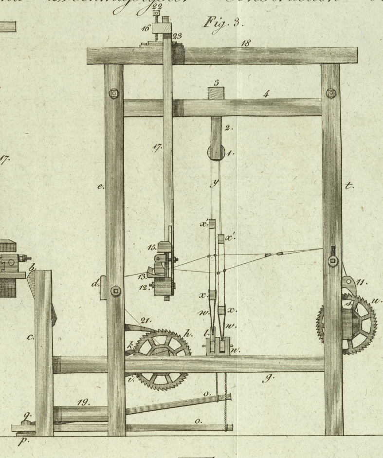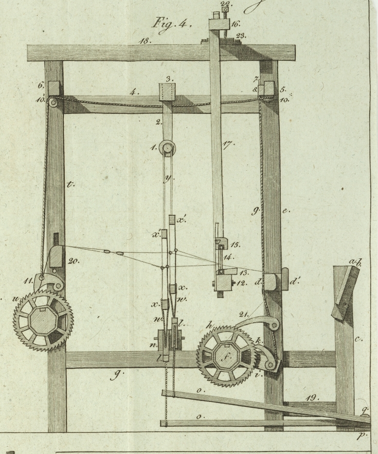Kette nachlassen kann. 12, 13, 14, 15, 16 und 17, sind die Haupttheile der Lade,