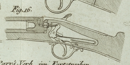 Zuͤndkraut in die Kammer abzusezen, und wird durch die Feder, e, ruͤkwaͤrts in Thaͤtigkeit