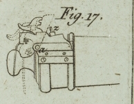 einzeln und abgenommen dargestellt, so wie die Spiral-Feder, b, die ihn zuruͤkzieht, und das Schraubenniet,