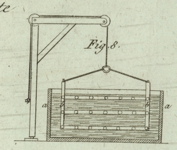 Ein anderer Apparat zu demselben Zweke ist in Fig. 8. dargestellt. a, a, ist ein vierekiges Faß mit der Farbebruͤhe;