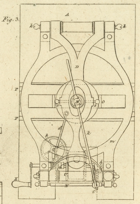 anderes Ende laͤngs einem Zifferblatte an einem der senkrechten Pfeiler, C, laͤuft. Wenn diese Nadel, waͤhrend sie