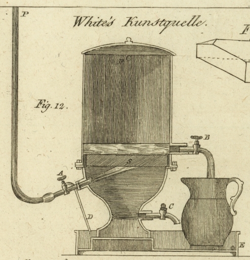 in dem Apparate befindliche Luft durch die Poren des Steines, S, aus, worauf das Wasser aufsteigt, und in einem Strome filtrirt bei B, so ausfließt, daß man in ungefaͤhr 2 Minuten