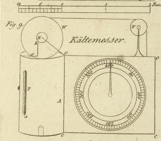 | Titel: | Kältemesser (Frigorimeter), oder Instrument zur Bestimmung, um wie viel ein Metall durch die Kälte zusammengezogen wird. |