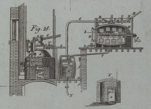 mit kaltem Wasser gefuͤllt werden muß, und eben so das Faß H. Dann muͤssen die Haͤhne N, L und U und die Klappe