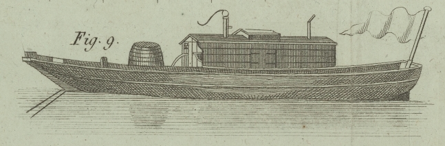 eine Barke mit dem Filtrir-Apparate, die an der Seite eines zum Absegeln