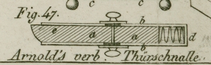 | Titel: | Verbesserte Thürschnalle oder vielmehr Thürriegel, worauf Joh. Arnold, Pulverhornmacher zu Sheffield in Yorkshire, sich am 26. Jäner 1830 ein Patent ertheilen ließ. |