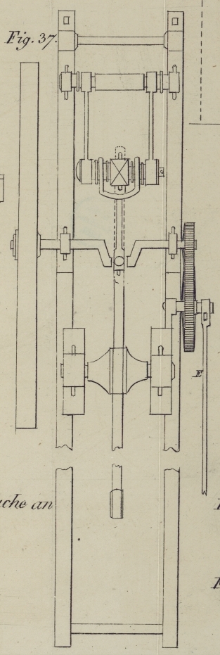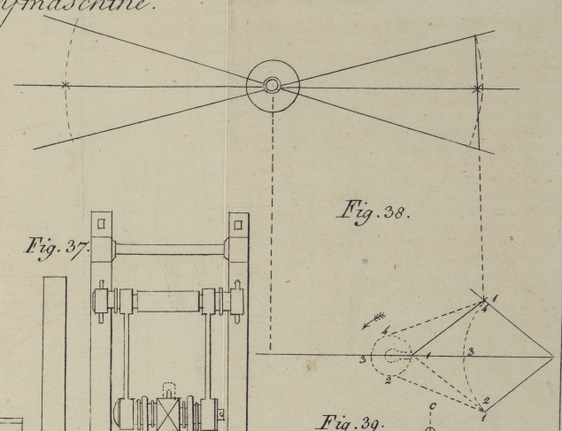 dieser Maschine und Fig. 38 eine geometrische Darstellung der Linien dieser Hebelbewegung.