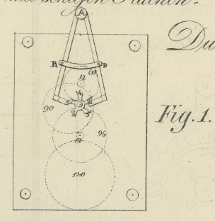 gewoͤhnliche Zaͤhlrad, und dieser Rechen steigt auf einen Grad herab,