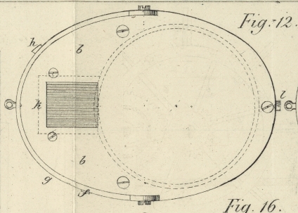 Ausschnitte bewirken eine unwandelbare Stellung der Haare. Die Magnetnadel d ist gehoͤrig fixirt; der Compaß deutet auf O, wenn man gegen den magnetischen Nord visirt, wie Fig. 15 zeigt.
