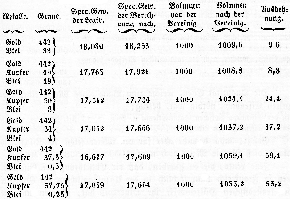 Berechnung nach; Volumen vor der Vereinig.; Ausdehnung; Gold; Blei; Kupfer