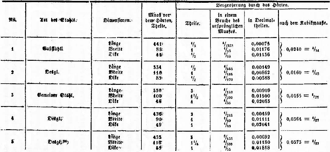 Haͤrten; Art des Stahls. Gemeiner Stahl. Laͤnge; Breite; Dike;
