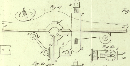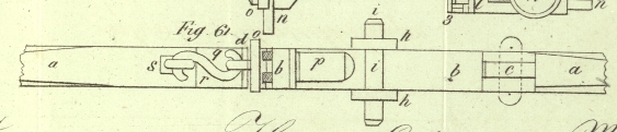 Ring q auf der schon erwaͤhnten Scheibe o, andererseits in einen Ring s eingehangen ist. Dieser leztere befindet sich am Ende eines durch a gehenden Bolzens s, t,
