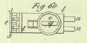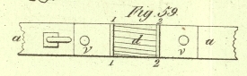 von d bedeutet. Fig. 59 zeigt bei v, v zwei runde Loͤcher des Bakens d, womit derselbe auf zwei Stifte des Theiles a aufgepaßt ist; aͤhnlich ist die Befestigung des