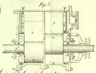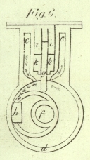 der Dampf als die Dampfwege abwechselnd geaͤndert. h ist ein loses in den vorspringenden Theil des Kolbens e eingepaßtes Stuͤk, welches bestaͤndig