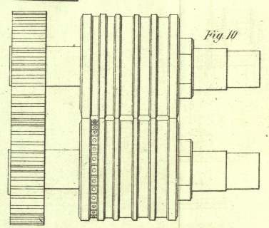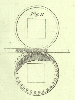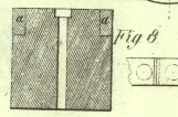 LVII. Verbesserungen in der Fabrication von Nieten, Schraubenbolzen und anderen derlei Gegenstaͤnden, worauf sich Alexander Stocker und Henry Downing in Birmingham, am 29. Sept. 1836 ein Patent ertheilen ließen. Aus dem Repertory of Patent-Inventions. August 1837, S. 76. Mit Abbildungen auf Tab. IV. Stocker's und Downing's verbesserte Fabrication von Nieten, Schraubenbolzen etc. Unsere Erfindungen bestehen 1) in verbesserten Modeln zur Verfertigung von Nieten, Stiften und Schraubenstiften. Sie beziehen sich aber 2) auch auf eine verbesserte Methode die Schraubenmuttern zu verfertigen. Es ist bekannt, daß mit den gewoͤhnlichen Nageleisen das Formen der Koͤpfe der Schraubenbolzen, Nieten und großen eisernen Stifte, Arbeit und Zeit kostet. Diesem Uebelstande suchten wir nun durch eine eigenthuͤmliche Methode, die Model zu gießen, abzuhelfen. Wir verfertigten uns in dieser Absicht einen Kern von der gewuͤnschten Form und Groͤße der Matrize; haben wir uns auf solche Weise einen Model verschafft, so steken wir einen Stift, Bolzen oder Schraubenbolzen von der Gestalt, welche der Model geben soll, so ein, daß wenn der Model mit Eisen ausgegossen wird, eine Matrize erzeugt wird. Wenn dann der Stift oder Schraubenbolzen oder die Niete gehoͤrig abgekuͤhlt ist, so schlagen wir ihn heraus, und erzielen solcher Maßen auf wohlfeile Weise einen Model, der eben so gut ist, wie einer, welcher aus Eisen geschmiedet und mit Stahl ausgetrieben wurde. Um diesen Modeln die gehoͤrige Staͤrke zu geben, ziehen wir sie von der aus Fig. 8 ersichtlichen Gestalt vor; d.h. wir legen ihnen, wie man bei a sieht, einen schmiedeisernen Ring an, der heiß zwar leicht anzulegen ist, beim Abkuͤhlen aber sich fest um den Model zusammenzieht. In Hinsicht auf die Verfertigung der groͤßeren Schraubenbolzen, Nieten und Stifte selbst kommt zu bemerken, daß ausgewalzte, bei c, Fig. 9, verdikte und bei b und c zu durchschneidende Eisenstaͤbe die Bildung eines guten Kopfes, derselbe mag rund, vierekig oder anders geformt seyn, sehr erleichtern, und daß man hiebei den verhaͤltnißmaͤßig ohnedieß duͤnnen Schenkel oder Stiel des Stiftes nicht in einen Kopf zu erweitern braucht. Zu bemerken kommt auch, daß wir die Koͤpfe mittelst dieser Model in einer kraͤftigen Kurbelpresse erzeugen. Was den zweiten Theil unserer Erfindung, naͤmlich die Verfertigung der Schraubenmuttern betrifft, so besteht dieselbe darin, daß wir diese Gegenstaͤnde durch Auswalzen von Eisenschienen verfertigen. Fig. 10 zeigt ein hiezu geeignetes Walzenpaar; Fig. 11 hingegen gibt eine Ansicht eines damit erzeugten Eisenstabes. Die beste Methode diese Walzen zu verfertigen scheint uns, obgleich wir uns nicht auf sie allein beschraͤnken, darin zu liegen, daß man mehrere Eisenplatten von einer Dike, welche der Breite der zu erzielenden Eisenschiene entspricht, neben einander an Achsen oder Spindeln aufzieht. Auf der Oberflaͤche dieser Eisenstuͤke sind Vorspruͤnge oder Bunzen f, f anzubringen, und zwar in solchen Entfernungen von einander, daß jeder dieser Bunzen in die Mitte der zu verfertigenden Mutter gelangt, und auf diese Weise einen Eindruk oder ein Loch in derselben erzeugt, wie dieß aus einem Blike auf die Zeichnung erhellt. g, g sind Blaͤtter, die die Eisenstaͤbe zum Theil in Stuͤke von gleicher Groͤße schneiden, so daß jeder auf diese Weise zum Vorschein kommende Theil eine vierekige Schraubenmutter bildet, durch deren Mitte der Bunzen f geschlagen wurde. Hieraus erhellt, daß das erhizte Eisen, wenn es durch die Walzen, die durch ein entsprechendes Raͤderwerk mit gleichen Geschwindigkeiten umgetrieben werden, laͤuft, hiedurch zum Theil in vierekige Stuͤke abgetheilt und zum Theil auch in der Mitte durchgeschlagen wird. In der Zeichnung ist zwar nur eine der Walzen als mit den Bunzen f ausgestattet dargestellt; allein es lassen sich solche auch an beiden Walzen anbringen, wenn man die Vorsicht gebraucht, daß sie genau miteinander correspondiren. Die Maschine bedingt nicht nur eine bedeutende Ersparniß an Zeit und Handarbeit, sondern auch eine geringere Schwere, indem jene Stellen, welche ausgeschnitten werden sollen, und welche zum Theil durch die Bunzen ausgeschlagen worden sind, viel duͤnner und leichter ausfallen. Wir binden uns uͤbrigens nicht streng an die beschriebene Art von Walze, sondern behalten uns vor, sie auch massiv und aus einem Stuͤk zu verfertigen, und die Bunzen sowohl als die Schneidinstrumente gleich urspruͤnglich damit zu verbinden, oder erst spaͤter daran zu befestigen.