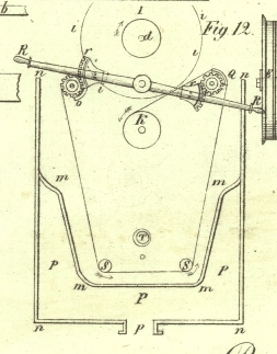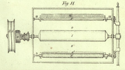 oder Zahnraͤder eingreifen. An den unteren Theilen der inneren Kammer O laufen frei die Fuͤhrwalzen S, S um.