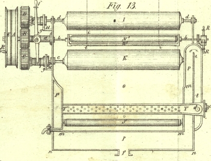 die Farbbruͤhe durch bewegt und abwechselnd auf die Walze I oder auf die Walze R