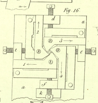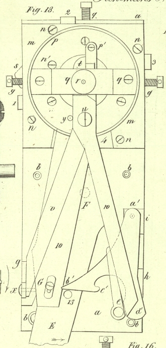 Hebel e', f', und bewegt mittelst desselben den Arm w so, daß die Schere sich oͤffnet. Indem w den Stift d' vor sich