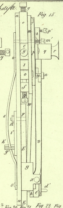 sich links vor den Stift 13 legt. Endlich nimmt der Stift g' der Platte i' den Schieber s mit sich, und stellt ihn so, daß durch denselben die