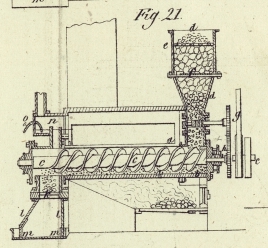 ihrer ganzen Laͤnge nach laͤuft die endlose Schraube c, c, c, welche mit ihren Enden in gasdicht schließenden