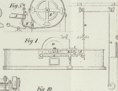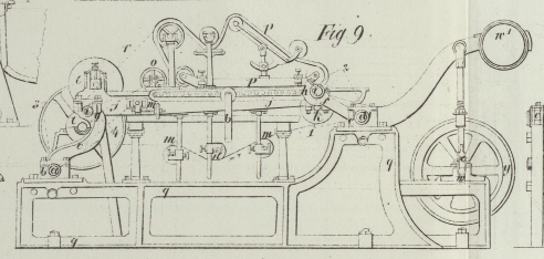 Bewegungen der Maschine zu balanciren. Während der Umdrehungen der Achse x hebt und senkt nämlich die Kurbel w den so eben erwähnten Hebel mit dem Gewichte w' und veranlaßt dadurch den Hebel f und die in den Lagern h