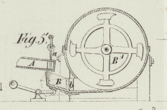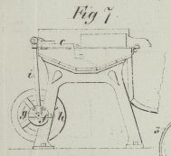 Mit dem Hebel c ist ein Sperrkegel d verbunden, welcher in die Zähne eines Sperrrades e eingreift. Das Lager, worin sich die Achse dieses Sperrrades dreht, sizt