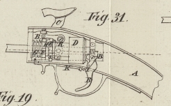 und das Gewehr entladet. Mit dem Hahn steht ein mit zwei Klauen versehener Hebel A in Verbindung; gegen die eine Klaue wirkt die große