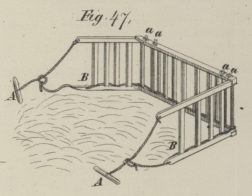 Vorrichtung. Sie besteht aus Eichenholz und nur die vier Pfeiler a, a, a, a sind aus Eisen. Die lezteren endigen sich
