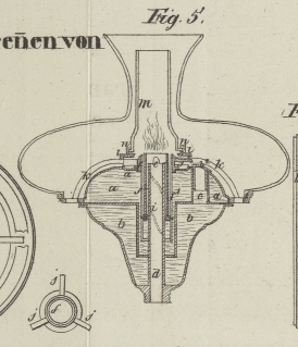 j befestigt, gegen deren eine ein Arm des Glasschirmgestelles k sich lehnt, so daß, wenn das Gestell k gedreht wird, auch das Rohr f sich dreht und den Docht höher oder niedriger stellt. l ist die Galerie für das gläserne Zugrohr m. Lezteres