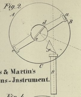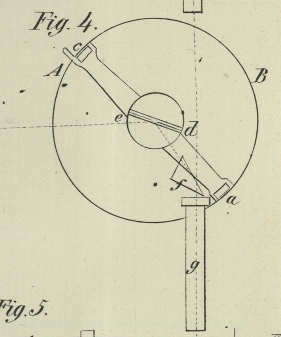A, B, C ein Kreis von 5'' Radius; die Alhidade a. C mit gegenüberliegenden Nonien trägt den Spiegel d, e, dessen nach B liegende