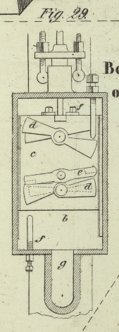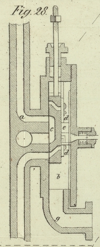 LXIV. Bourdon's Expansions-Schieberventil. Aus dem Civil Engineer and Architects' Journal. Febr. 1845, S. 57. Mit Abbildungen auf Tab. IV. Bourdon's Expansions-Schieberventil. Bourdons Expansionsschieber unterscheidet sich von den bereits bekannten durch die Anordnung der Theile, welche die Dampfwege bilden, so daß der Dampfzufluß plözlich beim Eintritt in den Cylinder unterbrochen wird. Fig. 28 und 29 werden seine Construction hinlänglich klar machen. Fig. 28 ist ein Durchschnitt durch die Mitte der Schieber und Dampfwege, und Fig. 29 ein Grundriß der Schieber mit den Platten, welche die Dampfwege verschließen. a ist der Cylinder mit den Dampfwegen. b Dampfbüchse, c Schieberventil mit vier paarweisen Oeffnungen. d, d Platten, um diese Oeffnungen zu verschließen; sie drehen sich um stählerne Achsen. e ist ein Regulator; er ist auf einer conischen Achse befestigt (und mit derselben drehbar), welche durch die Wand der Dampfkammer geht und außen einen kleinen Hebel trägt, mittelst dessen der Regulator entweder von Hand, oder durch irgend einen beweglichen Theil der Maschine bewegt wird. f, f zwei Zapfen, deren Länge bei jedem Kolbenhube das Oeffnen der Dampfmündungen bedingt. g Dampfzuflußröhre. Die Bewegung des Apparats ist sehr einfach; ist der Regulator e so schief gestellt, daß seine Enden nicht mit den Platten d in Berührung kommen, so wird der Dampf während des ganzen Kolbenhubes einströmen; ist er aber nach der entgegengesezten Seite hin schief gestellt, so werden die Dampfmündungen verschlossen. Das Verschließen der Mündungen geschieht um so früher, je eher die Enden des Regulators mit den Platten d, d in Berührung kommen. Hiedurch kann die Expansion so regulirt werden, daß der Dampfzufluß von 1/20 bis zu 1/2 Kolbenhub unterbrochen werden kann. Wäre z.B. eine Expansion von 5–7 Zehnteln erforderlich, so ist es hinreichend, ein Excentricum anzuwenden, das so regulirt ist, daß der Dampf nur innerhalb dieser Gränzen einströmen kann.