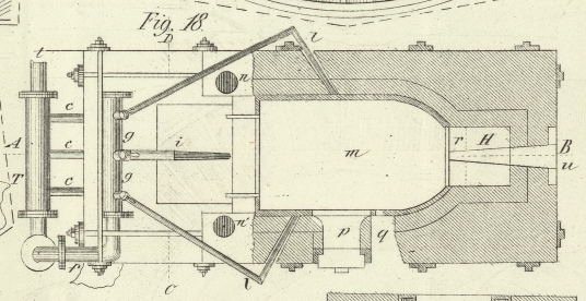 Rostfeuerung h unter dem Cylinder g konnte zu Erhöhung der Temperatur des in den Ofen getriebenen