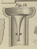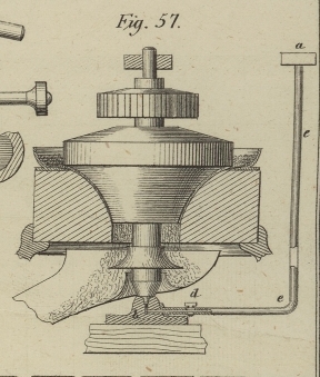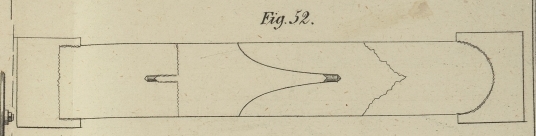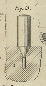 III. Versuche über die Reibungs-Curve; von C. Schiele. Mit Abbildungen auf Tab. I. Schiele's Versuche über die Reibungs-Curve. Um die Natur der Reibung solcher Flächen, die einen Druck in der Richtung ihrer Achsen zu tragen haben, durch Experimente zu finden, und Vergleiche mit der von mir gefundenen FormMan vergl. die Abhandlung des Verfassers, S. 331 im vorhergehenden Band des polytechn. Journals. anzustellen, drehte ich aus sorgfältig präparirtem Gußeisen verschiedene Formen von gleichem Durchmesser, prüfte die Wirkung der Reibung und verglich jede einzelne Form mit der meinigen. Ich brachte nämlich eine der bisher bekannten mit der meinigen zusammen in einen Apparat, mit welchem ich im Stande bin irgend nöthigen Druck in der Richtung der Achsen wirken zu lassen und dabei die Theile gegen einander zu drehen. Fig. 51 zeigt einen Querschnitt der verschiedenen Formen welche ich prüfte, und Fig. 52 einen Querschnitt derselben nach den Versuchen. Die neue Curvenform zeigte dadurch unzweifelhafte Vorzüge, daß dieselbe am Ende immer den drehenden Theil abgab, während die andern Flächen wie fest mit einander verbunden erschienen. Die Ursache der unregelmäßigen Reibung der gewöhnlich benutzten Flächen, wie in Fig. 53 gezeigt, ist leicht erklärlich, wenn man die Verhältnisse der Reibungs-Curve beobachtet, die aufs deutlichste zu erkennen geben, welchen unregelmäßigen Druck die Abreibung auf anders geformte Flächen geben muß. Aus diesen Erfolgen ist deutlich zu ersehen, daß man bedeutend kleinere Flächen anwenden kann (wenn sie nach der neuen Art angefertigt sind) als bisher, was natürlich von großer Wichtigkeit im Maschinenfach ist, um weniger Kraft auf Ueberwindung der Reibung verschwenden zu müssen. Die Uebereinstimmung dieses Princips mit dem Wirken der Natur ist ein Hauptstützpunkt für dessen Richtigkeit. – Durch folgenden Versuch kann sich Jedermann leicht selbst hievon überzeugen. Man nehme zwei Stücke Kreide a und b; Fig. 53 a, cylindrisch an einem Ende zugespitzt und in b eingepaßt; bohre den Mittelpunkt der Höhlung in b aus und reibe beide Stücke gegen einander; reinige die Flächen von Zeit zu Zeit mit einem feinen Bürstchen und entferne die Sandkörnchen, welche in die entgegengesetzte Fläche einkratzen. In kurzer Zeit werden die Flächen sich zur Curvenform hinneigen und sich der beschriebenen desto mehr nähern, je länger der Versuch fortgesetzt wird. Die punktirten Linien in der Zeichnung sollen zur Verdeutlichung des Gesagten den Erfolg bezeichnen. Folgende Skizzen sollen einige andere Anwendungen vorführen, die mir von Wichtigkeit scheinen. Fig. 54 ist ein Pumpenventil. Fig. 55 und 56 sind Wagenachsen und Fig. 57 Mühlsteine nach dieser Form construirt. Die Welle hat ihren Stützpunkt nach der Curvenform eingerichtet, und es ist dabei zu gleicher Zeit eine Methode zum Schmieren angegeben. Ein Oelgefäß a wird in eine angemessene Höhe gestellt und mit dem kleinen Loch im Mittelpunkt der Büchse b, in der die Curve geht, durch ein Rohr c verbunden. Der Druck des Oels bewirkt ein zuverlässiges Schmieren, das durch einen kleinen Hahnen d leicht geregelt werden kann. Manchester, im Junius 1849.