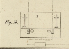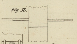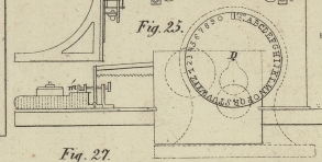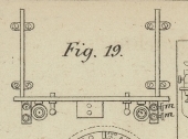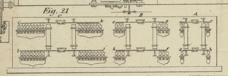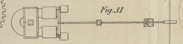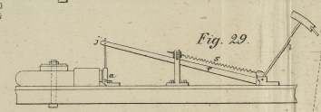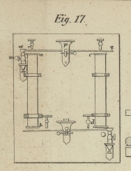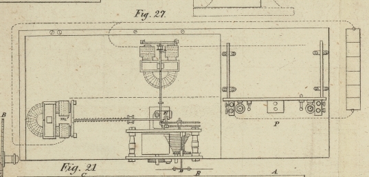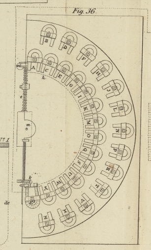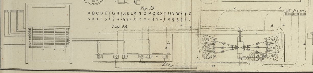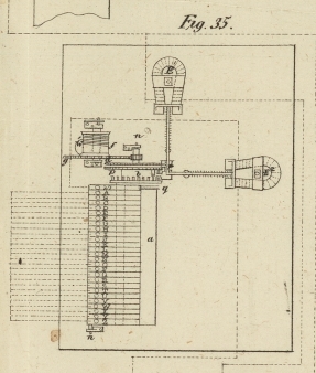 angeordnet, daß die zu ihnen gehörigen Letternhämmer alle auf denselben Punkt m des Cylinders schlagen können. m ist ein Cylinder, welcher durch eine Schraube eine Längenbewegung und durch das