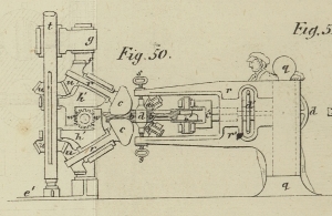 Peripherie des Rades. Sie befinden sich in verschiebbaren Gestellen c' und werden mit Hülfe der Handräder d', d' und der an das Gestell c' befestigten Schrauben der Achse d genähert